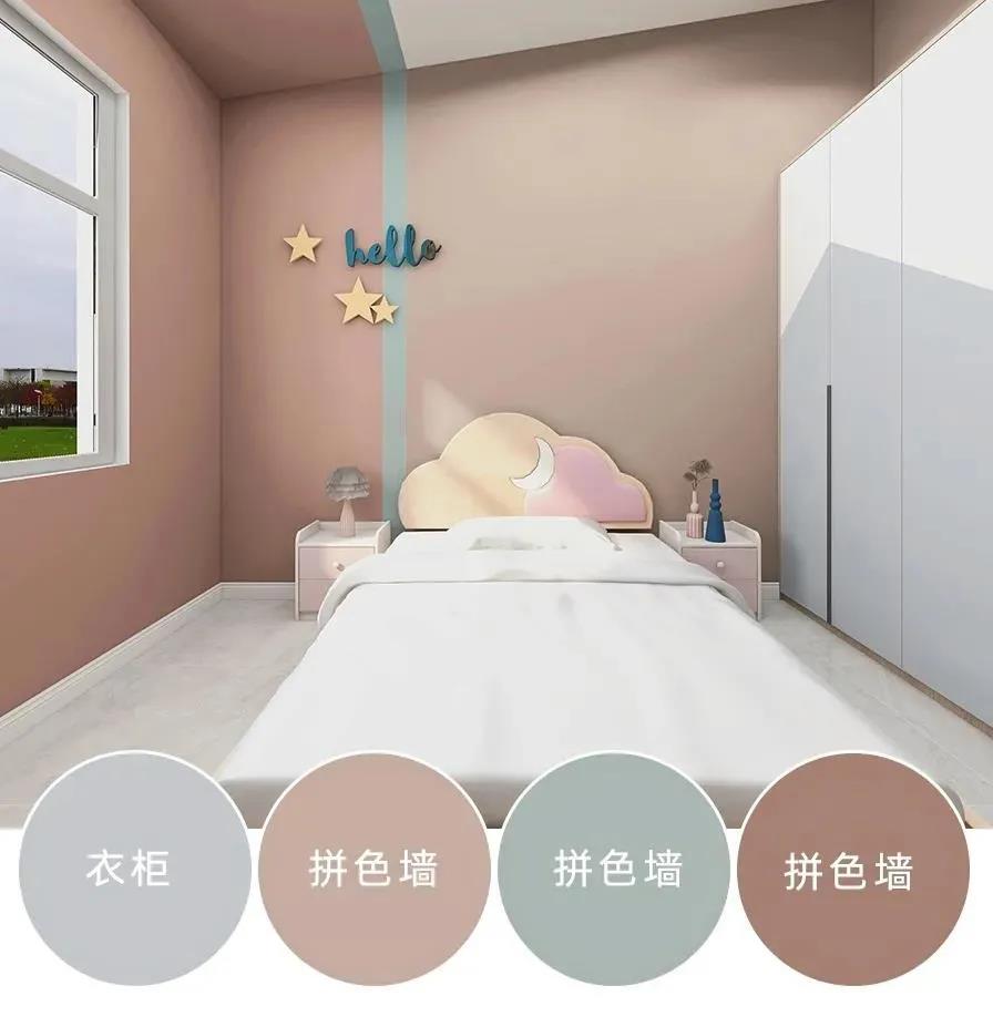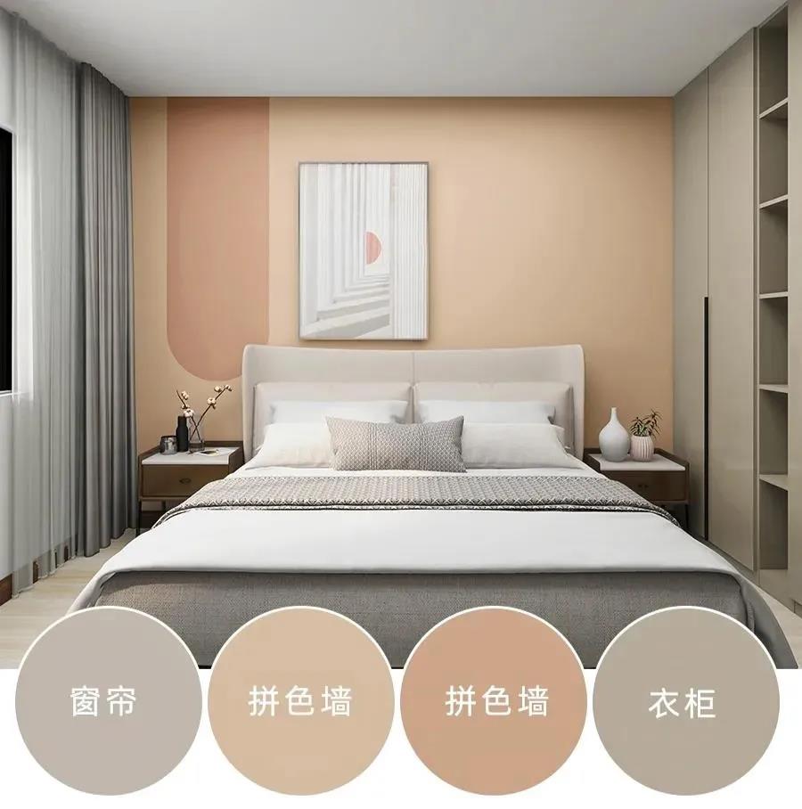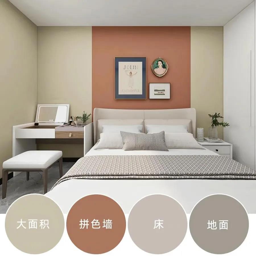 驼色和橘粉的拼色在色彩上属于同色系的搭配手法,这种搭配方式看起来很舒服不会有违和感,是一种比较常见保守的配色方式,同色系的拼色的搭配很适合装修小白来尝试,拼色的手法会让墙面更有设计的感觉。