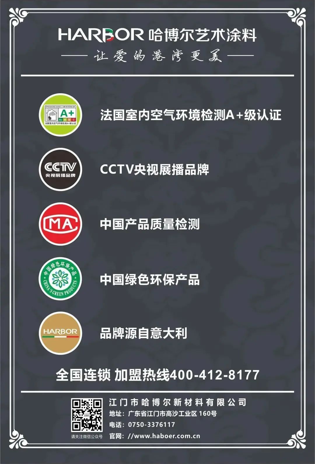 HARBOR(中文名 哈博尔) 英译为”港湾”,是家的喻义。每个人心中都有一个港湾,哈博尔艺术涂料秉持“让爱的港湾更美”愿景,