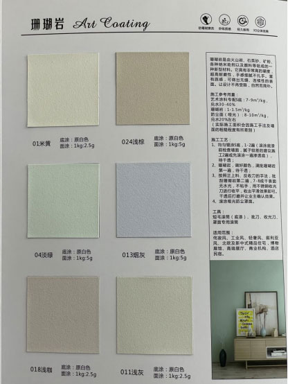 缤纷彩片易擦洗,防霉防潮仿细微裂缝,配以高科技净味无添加环保配方,双重净味,环保加倍,让你拥有一个尊贵典雅又不失浪漫的健康居家环境。缤纷彩片能在墙面形成恰到好处的各种复古色彩和不规则自然花纹,并且还具有多彩质感,让人感到时尚大方又有个性,尊贵典雅而又不失浪漫。