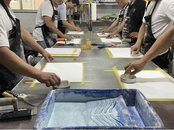 培训期间,学员们进行了十一款市场主流产品技术实操培训,针对不同材料、样板效果的施工手法和技术工艺进行了详细的教学。对学员提出的疑问进行一对一的细化讲解与指导。