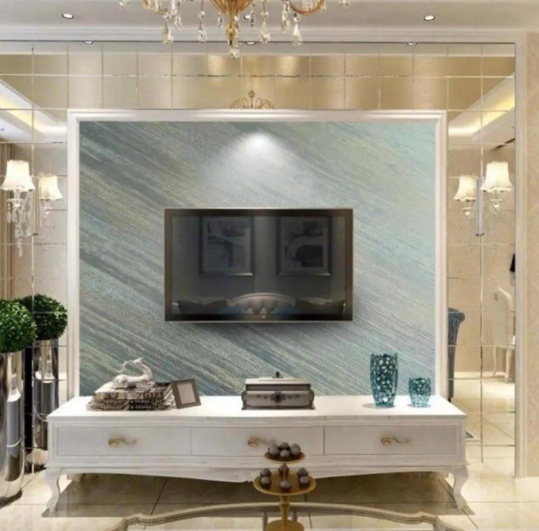 闪耀的银砂中蕴藏着淡雅的蓝,隐约中的灰色仿佛无尽苍穹,搭配象牙白电视柜,精美吊灯照耀下熠熠生辉,彰显贵气,体现主人的雅致生活品味。