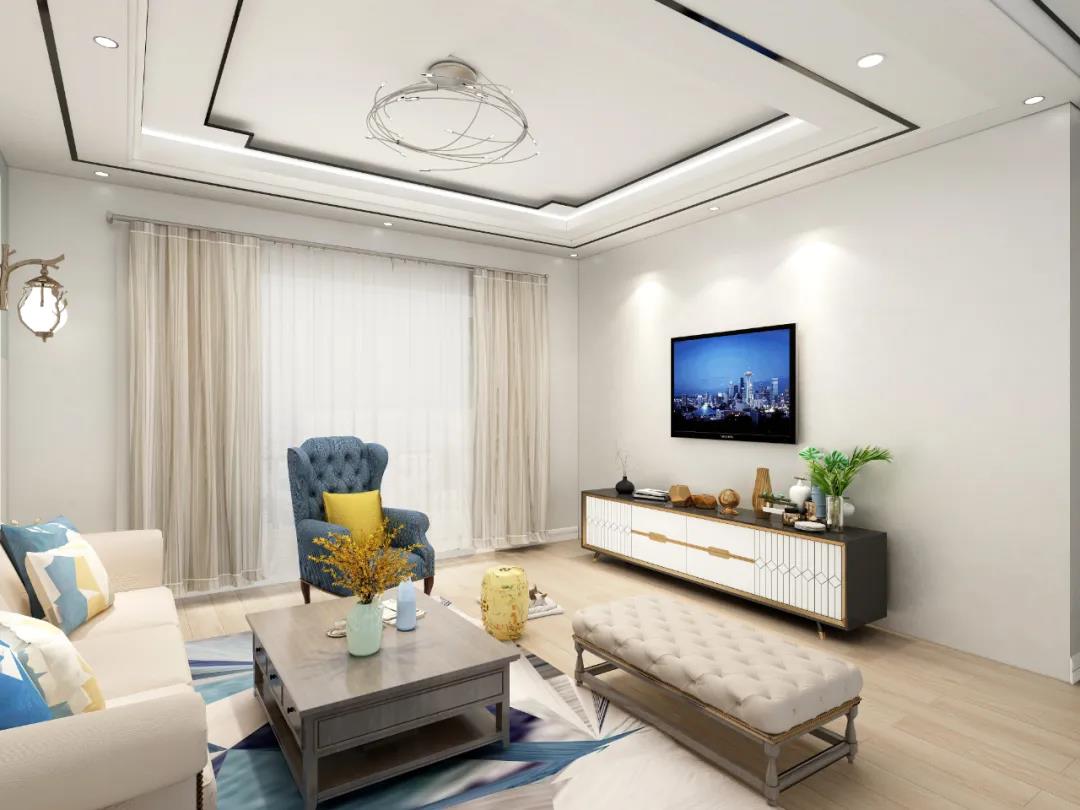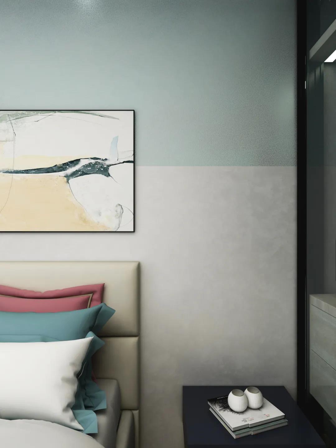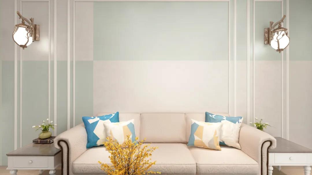 客厅的背景墙使用青绿色彩片拼接,几何的墙面图案与鲜亮的色彩,温柔的现代风格软装组合,打破狭小客厅的沉闷僵硬,给人更加开阔和明朗的视觉享受。