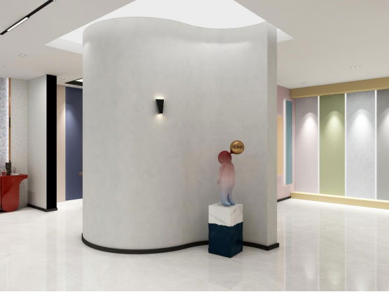 珊瑚岩由火山岩、石英砂、矿粉、各种纳米助剂以及颜料等调和而成,手感细腻,同时具有超高耐磨性,刚柔并济。它能以极薄的厚度做出美观的无缝表面,施工简单;设计不再受限,与特殊造型适配度高,亦能与任意颜色都完美融合,工艺与色彩融合,实现墙顶地一体化完美呈现。