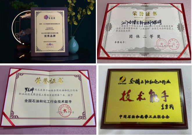 2023年十大设计师推荐品牌、第十四届全国石油和化工行业职业技能竞赛团体二等奖、2023年中国艺术涂料优秀品牌……金光闪烁的奖牌、荣誉,是哈博尔品牌建设进阶路上收获的累累硕果。