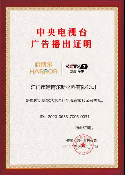 2020年6月22日,经过中央电视台层层严格筛选,哈博尔艺术涂料正式登陆中央电视台国防军事频道。此次亮相央视广告,是哈博尔品牌发展史上的又一重大里程碑,不仅意味着哈博尔艺术涂料将被更多的消费者所熟知,也揭开了哈博尔艺术涂料品牌宣传的新篇章,同时也极大提高了哈博尔艺术涂料的影响力和传播力。